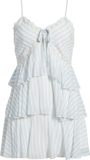 Shades of sea and sky stripe a dreamy little dress shaped with rows of ruffles and lilted with dainty lace.