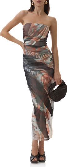 A curve-loving silhouette meets high-impact drama in this ruched mesh dress with a back slit that guarantees effortless movement.