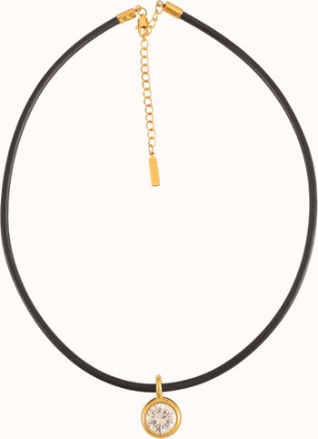 Elevate your style with the Marlow Bezel Drop Necklace, featuring a leather cord and a stunning Hollis Bezel Drop Charm. This necklace combines elegance and modern design.