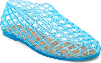 A lattice-inspired caged silhouette shaped from translucent jelly updates a slip-on that's a playful take on a classic ballet flat.