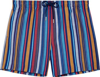The Marni Beach Boxers embody an elegant and contemporary vision inspired by Italian chic and Mediterranean summers. Their sunny striped print, in shades of yellow, orange and red on a navy blue background, adds a bold yet elegant touch. The irregularly spaced stripes offer a balanced and timeless design. The versatile design is perfect for swimming and relaxing by the sea. The modern, loose mid-thigh cut with side pockets and piped pocket at the back offers an elegant silhouette without sacrificing comfort.