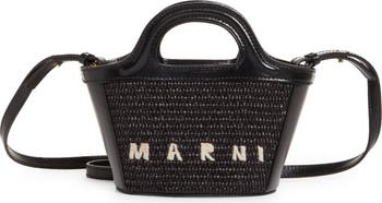 Sized small to hold the bare minimum of summery essentials, this trendy top-handle bag features a removable strap and woven panels stitched with logo letters.