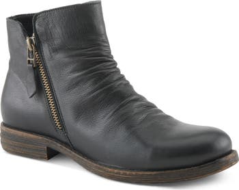 Dual side zippers create modern appeal and offer easy entry in a rich leather bootie balanced by an almond toe and low block heel.