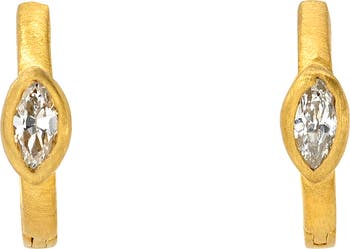 Marquise-cut diamonds in vintage-inspired bezel settings illuminate a pair of huggie hoops crafted in the USA from gleaming 18-karat gold with a brushed satin finish.