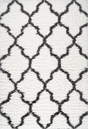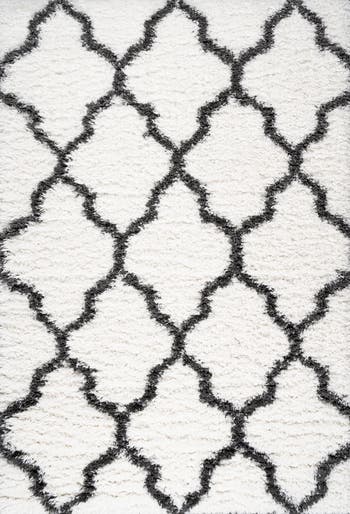 Soft and fluffy yarns make it easy to go barefoot on this shag rug with an ogee trellis design. The deep charcoal and ivory colors have a graphic punch adds Bohemian appeal. Perfect for a bedroom, living room, or cozy reading nook, this is a shag rug with timeless style.