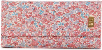 Attention globetrotters, take our Jewelry Wallet wherever you go while keeping your jewelry in place whether - business, leisure, and everything in between. Our sleek, high functioning wallet has 2 inside zip pockets, snap tabs for chains, a pendant pouch, ring roll and earring bar with a protective flap. Lined in our New chic pink pinstripe cotton!