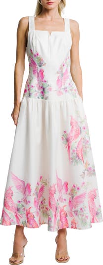 Flamingo-hued parrots gather at the skirt of this floral sundress fashioned with a notched square neck and cut to a flowy maxi length.