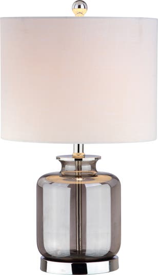 Inspired by collectible colored glass vases and bottles, the smoked glass table lamp is a perfect accessory for cottage-style interiors. Silver fittings, gray glass, and an off-white cotton hardback drum shade update the romantic vintage look. A silk-wrapped cord completes the elegant look.