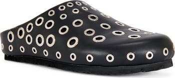 An array of polished grommets bring contemporary edge to this slip-on mule set on a low platform sole for a bold, grounded finish.