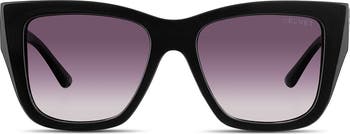 Marsha by Velvet Eyewear is a women's modified square sunglass in shiny black with grey fade lenses that provide 100% UV Protection. This sunglass boasts slightly cat eye corners for a playful, uplifted look, along with raised gold accents and hinges. Designed to flatter medium to wide faces, this sunglass perfectly complements oval, round, and heart face shapes.