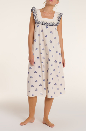 Indulge in feminine charm and easy elegance with our Martha Cover-Up. This midi-length silhouette features a striking square neckline, framed with smocked ruffle detailing in deep navy for a bold yet playful finish. Sprinkled with delicate embroidered motifs throughout, the Martha brings artisanal beauty to a lightweight, breezy shape. Perfect as a statement cover-up or worn solo for warm, sun-soaked days—this piece is a must-have for the woman who loves timeless details and effortless sophistication.
