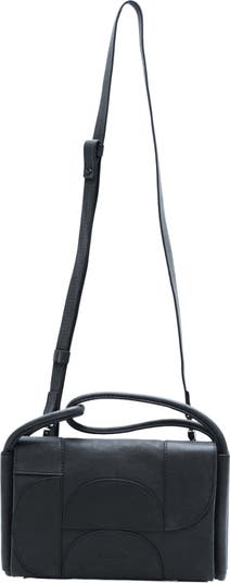 Geometric overlays bring an artisanal aesthetic to a rich leather crossbody bag featuring multiple pockets and an adjustable strap for on-the-go convenience.