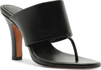 Croc-embossed leather amplifies the modern allure of a thong sandal balanced by a wide strap and tapered heel.