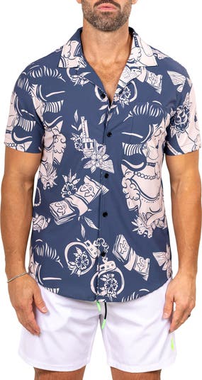 This printed camp shirt made of durable stretch nylon brings refreshing comfort to any warm-weather outing. Wear it on its own or layered and open to change up your look without ever losing your style.