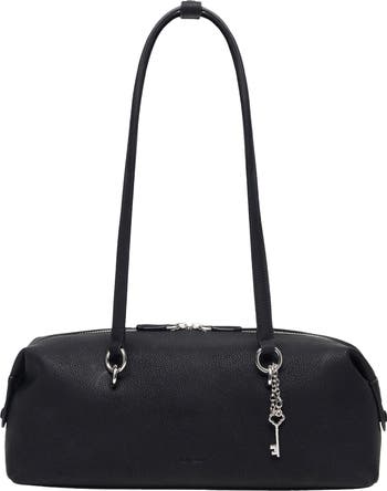 Polished hardware and a rich leather exterior highlight the east-west profile of a softly structured bag suspended from a pair of elongated shoulder straps.