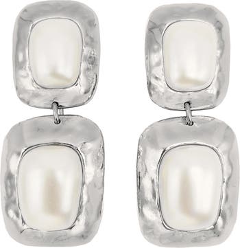 Polished faux pearls or cabochons nestle within molten frames on geometric drop earrings that deliver eye-catching shine.