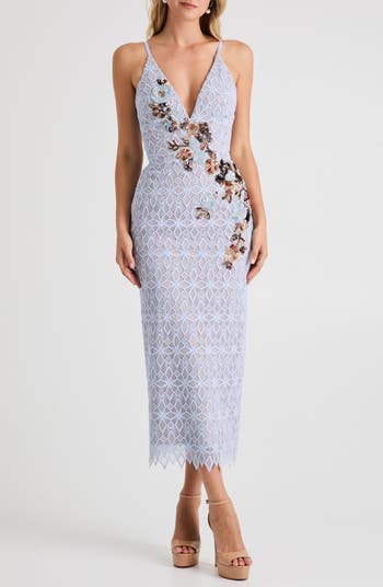 Geometric lace and dazzling floral appliqués make this midi dress an absolute stunner that's perfect for your next big event.