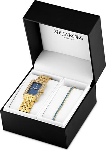 Watch in gold-plated stainless steel with a polished finish and white zirconia - and a bracelet in 18-karat gold-plated 925 Sterling Silver with blue zirconia.