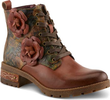 Brand-signature rainbow topstitching and 3D floral appliquès highlight the artisanal fabrication of this handcrafted bootie set upon a toothy lugged sole.