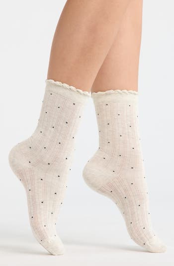 Make your footwork feel extrafancy with these cotton-rich crew socks sweetened with scalloped cuffs and classic polka dots.