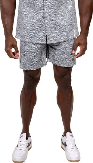 A patterned knit brings soft, stretchy comfort to relaxed- fit shorts that are cinch at the waist with a drawstring.