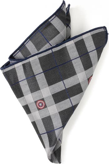 Captain American's iconic Vibranium shield pops throughout the checks of this silk pocket square.