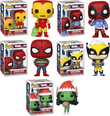 Marvel Holiday Funko Pop! Complete Set (5). Includes Deadpool, Iron Man, She-Hulk, Spider-Man, and Wolverine.