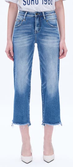 Heavy sanding and whiskering create a lived-in aesthetic on stretch-kissed denim jeans cut in a straight-leg profile with frayed, abbreviated hems.