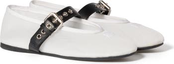Moto edge and ballet-core style merge on this logo-embroidered ballerina flat featuring a breathable mesh upper and roller-buckle leather strap.