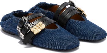 Logo hardware gleams on the buckle straps of this square-toe denim flat that's an updated take on a classic style.