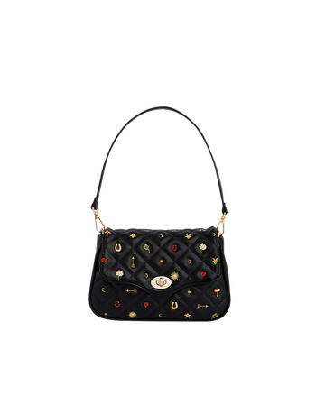 Elevate your style with our Mary Motif Quilted Crossbody Clutch. This luxurious quilted bag features playful embroidered celestial motifs, stars, moons, horseshoes, hearts, suns, and lucky charms scattered across the quilted diamond pattern. Finished with gold-toned hardware, twist-lock closure, and adjustable shoulder strap for versatile styling. Perfect for day-to-night sophistication, this statement piece brings a touch of magic to every look.