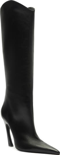 Complete your look with the bold, modern attitude of a sleek leather boot that makes a high-impact statement down to the stiletto heel and pointy toe.