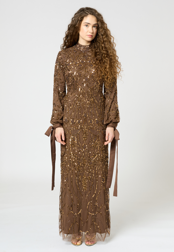 Radiate quiet confidence in this beautifully designed modest sequin dress. A perfect blend of soft shimmer and classic styling. It is made to make you shine subtly and gracefully. Ideal for those who love a bit of glamour with their grace.