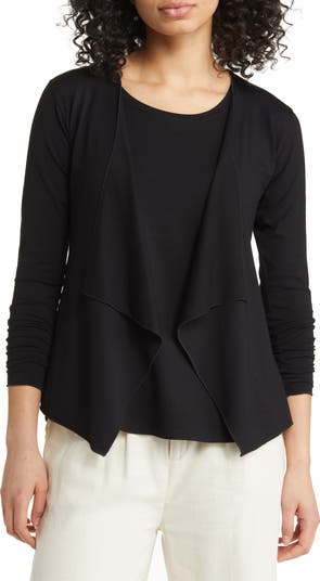 Cascading lapels draw the eye in to this lightweight and stretchy open-front jacket that adds interest to your layered looks.