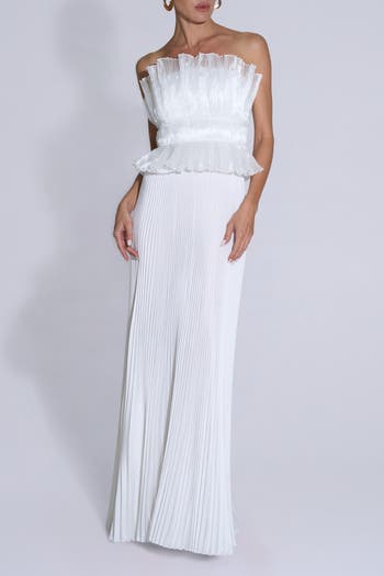Exquisitely crafted with intricate pleats and a corseted bodice, the Masquerade creates a flattering silhouette showcasing the décolletage and extending into an extravagant full length silhouette.