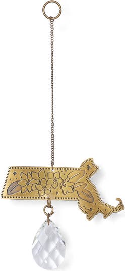Honor Massachusetts with a state-shaped suncatcher featuring the historic Mayflower bloom, engraved into brass with artisan detail. This symbolic state flower connects to the states heritage while bringing gentle beauty to your windows. A faceted crystal reflects rainbows of light, adding warmth and charm to any room. Perfect as a gift for New Englanders or lovers of history and floral art.