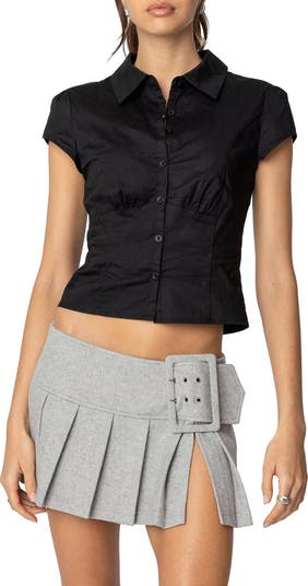 Corset-inspired tailoring brings a bit of structure to a slightly cropped shirt crafted from comfortable stretch cotton and framed by cute cap sleeves.