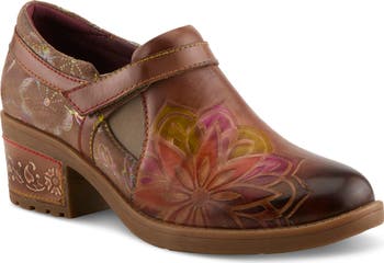 Hand-painted flowers and signature rainbow stitches enhance the artisanal feel of this leather pump featuring inset elastic gores and a lugged block heel.