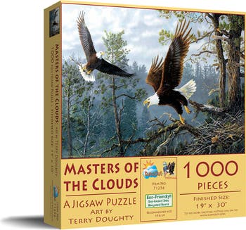 Uncover your creative side with the "Masters of the Clouds" 1000 piece adult jigsaw puzzle by SunsOut Puzzles. This irresistible puzzle, featuring majestic eagles by artist Terry Doughty, perfectly transports you into a scene that speaks volumes about the beauty of nature, measuring 19" x 30" once completed. The pieces seamlessly interlock due to meticulously high production standards, and it's formed from top-grade recycled cardboard, implicating a strong commitment to environmental responsibility. Also, the intriguing artwork presented in this puzzle is enhanced with vivid, eco-friendly soy-based inks to create an environmentally sound, visually enticing product. Proudly made in the USA, SunsOut Puzzles exemplifies local craftsmanship with universal allure. As a woman-owned enterprise, we value comprehensive quality control and offer a hassle-free guarantee to all customers. In the spirit of customer satisfaction, should there be any missing or damaged pieces, the issue will be promptly addressed. Be drawn into the serene world of puzzle crafting, safe in the knowledge that we're here to assist you every step along the way. The licensed artwork by renowned artists like Terry Doughty ensures that every piece resonates with authenticity and creativity, offering a captivating assembly experience marked by artistry and tranquillity.