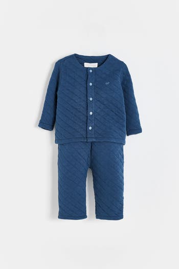 Cardigan and pants set made of soft matelasse. The cardigan has long sleeves and snaps down the front. The pants have an elastic waistband, allowing for a comfortable and easy fit.