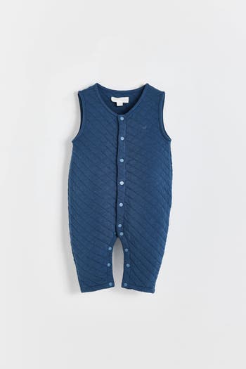 Sleeveless matelasse romper. The romper features snaps along the entire length for easy diaper changes. A practical and warm garment for your baby.