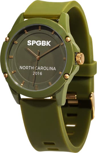 Enjoy teatime anytime wearing this matcha-inspired watch fitted with a matching silicone strap and a minimalist dial detailed with an homage to SPGBK's founding and North Carolina roots.