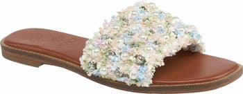 The MATERA slide sandal features a beaded pearl upper, leather lining, and memory foam insole—combining style and comfort for effortless everyday wear.