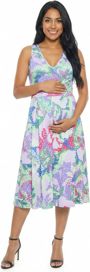 Bring effortless charm to your wardrobe with this maternity lilac abstract print sleeveless pleated pocket dress from 24seven Comfort Apparel. The fit and flare silhouette moves gracefully with soft pleating, while the V neckline adds polish. Functional pockets boost everyday ease. Pair with sandals or heels for versatile warm weather style, machine washable and tumble dry for simple care.