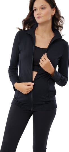 This active ribbed maternity jacket has strategically placed side zip panels that open up to give your bump some breathing room. Textured on the outside and soft on the inside.