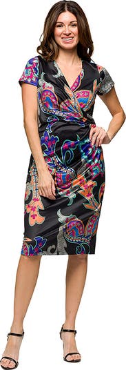 Step into style with this versatile Maternity Black Paisley Knee Length Short Sleeve Faux Wrap Dress. Featuring a chic V neckline and faux wrap detail, this dress flatters your silhouette while offering all day comfort. The knee length hem and short sleeves make it perfect for professional settings, cocktail parties, or casual outings. Designed with a bold paisley print and crafted from a comfortable polyester blend, this dress is as practical as it is stylish. Pair it with heels for a polished look or flats for a more relaxed vibe.
