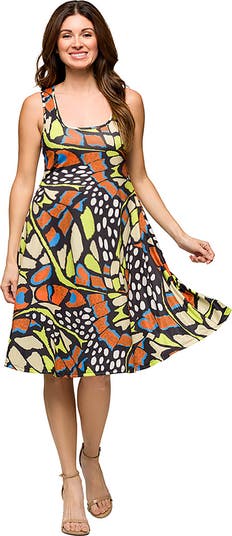 Embrace the beauty of nature with this butterfly inspired tank swing dress. This sleeveless design showcases a multicolor print of intricate butterfly patterns, adding a lively, artistic flair to your spring collection. The knee length, wide A line skirt offers a flattering fit, while the scoop neckline gives a contemporary touch. Crafted from our signature soft polyester blend, it is ideal for casual brunches or garden parties. Pair with wedges or flats for a graceful ensemble.