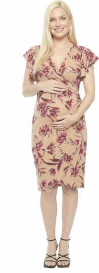 Add feminine charm and effortless elegance to your wardrobe with this maternity beige floral print faux wrap dress from 24seven Comfort Apparel. Featuring a flattering faux wrap silhouette, flutter sleeves for graceful movement, and a delicate red floral pattern on a soft beige background, it makes a subtle yet stylish statement. Cut at midi length with a figure-enhancing fit, it is crafted from soft, stretchy polyester blend and is machine washable for easy care.