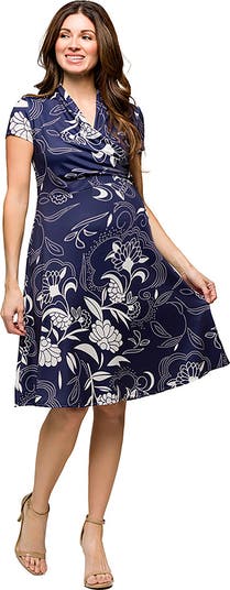 Discover effortless style with this Maternity Navy Print Short Sleeve Knee Length V Neck Wrap Dress. Featuring a flattering V neckline and a chic faux wrap bust, this dress highlights your silhouette with a touch of sophistication. The empire waist and knee length hem make it a versatile choice for workdays, casual outings, or special occasions. Crafted from a lightweight polyester blend, it is designed for comfort and all day wear. Perfect for pairing with heels or flats, this wrap dress is a wardrobe must have.
