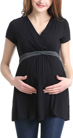 Designed for comfort, versatility, and effortless style, the Maternity Nursing Colorblock Tunic Top is made to support you through pregnancy and beyond. Featuring a flattering wrap-style V-neckline and empire waist silhouette, this tunic drapes beautifully over your growing bump while providing discreet nursing access for easy breastfeeding. The soft stretch fabric ensures all-day comfort, while the contrast waist detail creates a polished, feminine look perfect for everyday wear. Ideal for layering or wearing on its own, this maternity tunic transitions seamlessly from casual outings to workwear, making it a must-have staple for your maternity and postpartum wardrobe.